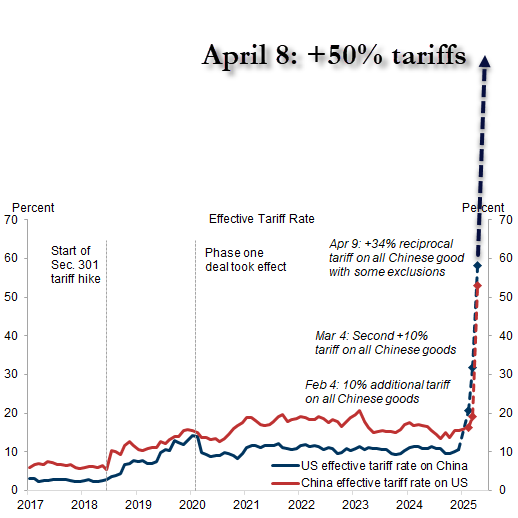 Εάν η Κίνα δεν αποσύρει τους δασμούς +34% που ανακοίνωσε στις 04.04 (με ισχύ 10.04), μέχρι την 08.04, μία επιπρόσθετη άνοδος στους υφιστάμενους δασμούς +50% θα επιβληθεί ανεβάζοντας το ποσοστό στο συνολικό 104% (με ισχύ 09.04).