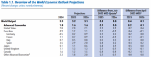 Το ΔΝΤ (IMF) προβλέπει (World Economic Outlook, 14.10.2025) ότι η παγκόσμια οικονομία το 2025 θα αυξηθεί κατά 3,2% (θετική αναθεώρηση κατά +0,2% από ΙΟΥΛ.’25) από 3,3% το 2024, ενώ το 2026 στο +3,1%.