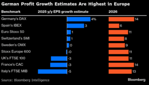 Ανάμεσα σε πολλές ευρωπαϊκές αγορές μεροχών, ο γερμανικός DAX προβλέπεται ότι το 2026 θα έχει ανάπτυξη κερδοφορίας +14% (από εκτ. 4,4% το 2025).