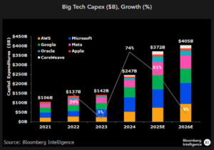 Οι μεγάλες αμερικανικές εταιρίες παροχής υπηρεσιών cloud έχουν ανακοινώσει επενδύσεις σε Τεχνητή Νοημοσύνη (AI) που υπολογίζονται σε $372 δισ το 2025 σημειώνοντας σημαντική αύξηση +51% σε σχέση με το 2024. Στις επενδύσεις αυτές ηγείται η Microsoft με $95 δισ (+26% y/y).