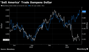 Ένα μίνι φαινόμενο ΄Πουλήστε Αμερική’, με πωλήσεις αμερικανικών assets: ομόλογα, δολάριο, μετοχές, σαν αυτό που οι αγορές αντιμετώπισαν τον Απρίλιο, έζησαν οι αγορές αυτήν την εβδομάδα. Η απόδοση του 30ετούς treasury έφτασε στο 5,161% (υψηλό από ΟΚΤ.’23) ενώ η απόδοση του 10ετούς έφτασε στο 4,629% (υψηλό από ΦΕΒ.’25)