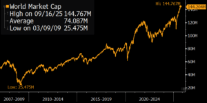 Η κεφαλαιοποίηση της παγκόσμιας αγοράς μετοχών υπολογίζεται στα $144,76 τρισ (Πηγή: BBG, 16.09.2025).