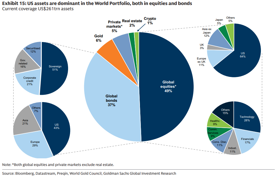 Το ‘Παγκόσμιο Χαρτοφυλάκιο’ της Goldman Sachs αποτελεί ένα δείκτη που περιλαμβάνει όλα τα επενδυτικά προϊόντα παγκοσμίως: μετοχές (MSCI AC World), ομόλογα (Bloomberg Global Aggregate, Global Inflation-Linked, Global High Yield, Municipal Bonds, Global high yield credit), private markets (Preqin), ακίνητα, χρυσό και τα 10 μεγαλύτερα κρυπτονομίσματα.