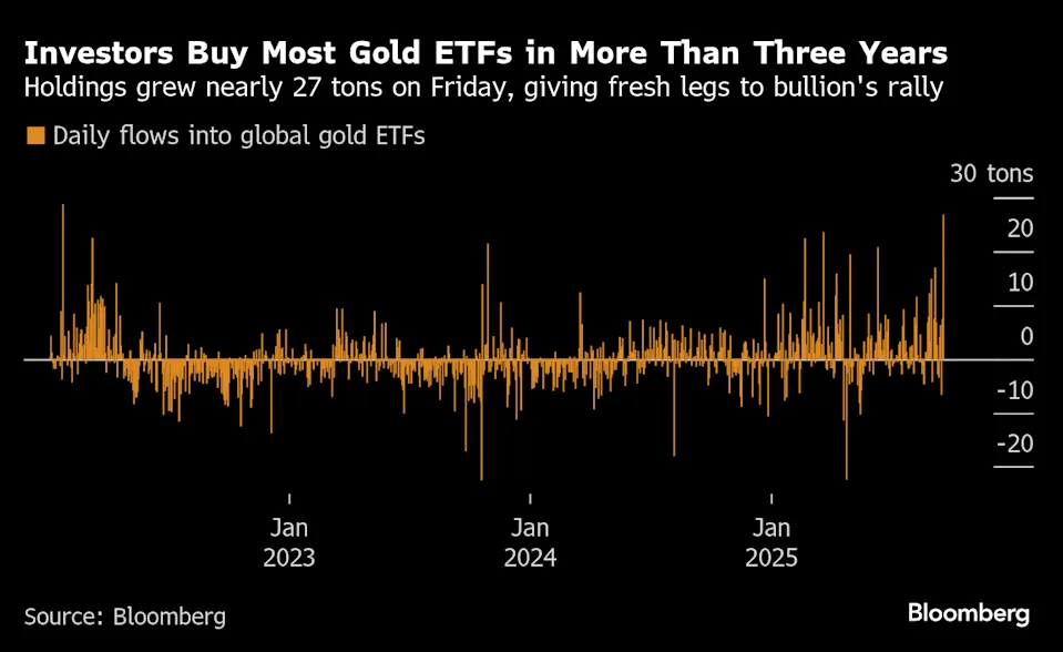 Την Παρασκευή 19.09.22025, σημειώθηκαν μεγάλες εισροές  σε διάφορα ETFs χρυσού παγκοσμίως που αντιστοιχούν σε 27 τόνους χρυσού που αποτελεί ημερήσιο ρεκόρ άνω των 3 ετών: