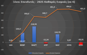 Τον μήνα Ιούλιο, οι ξένοι επενδυτές σημείωσαν καθαρές εκροές €-33,31 εκ. Παρολαυτά, το ισοζύγιο των συνολικών εισροών-εκροών της ελληνικής αγοράς μετοχών για το 2025 είναι θετικό στα €421,3 εκ.
