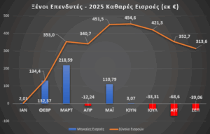 Τον μήνα Σεπτέμβριο, οι ξένοι επενδυτές σημείωσαν καθαρές εκροές €-39,06 εκ. Παρολαυτά, το ισοζύγιο των συνολικών εισροών-εκροών της ελληνικής αγοράς μετοχών για το 2025 παραμένει θετικό στα €313,6 εκ.