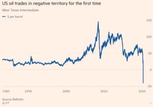 20/04/2020: Το πετρέλαιο σε αρνητική τιμή – Ιστορικό ρεκόρ $-40,32. Συγκεκριμένα, η τιμή του τρέχοντος προθεσμιακού συμβολαίου (spot – λήξης Μαϊου) του αμερικανικού αργού πετρελαίου (WTI) σημείωσε για πρώτη φορά στην ιστορία του αρνητική τιμή (από το 1983 που ξεκίνησαν τα συμβόλαια στο NYMEX). Το νέο ιστορικό χαμηλό του πετρελαίου που σημειώθηκε ήταν το $-40,32 το βαρέλι ενώ η τιμή εκκαθάρισης του συμβολαίου ήταν $-37,63.