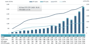 Τα συνολικά κεφάλαια υπό διαχείριση των ευρωπαϊκών ETFs, στα τέλη ΙΟΥΛ.’25 άγγιξαν τα $2,76 τρισ, που και αυτό αποτελεί νέο ιστορικό υψηλό.