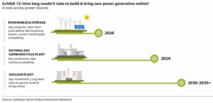 Η Goldman Sachs σε πρόσφατη έκθεσή της (GS: AI/Data Center Power Demand: The 6 Ps driving growth and constraints, 13.10.2025) προβλέπει ότι μέχρι το 2030 οι ανάγκες ηλεκτροδότησης των κέντρων δεδομένων (data centers) θα συνεχίσουν να εξυπηρετούνται από ανανεώσιμες πηγές ενέργειας σε ποσοστό 40%. Από το υπόλοιπο 60% το μεγαλύτερο κομμάτι αναμένει ότι θα καλυφθεί από το φυσικό αέριο. Η πυρηνική ενέργεια θα αρχίσει να συμβάλλει μετά το 2030.