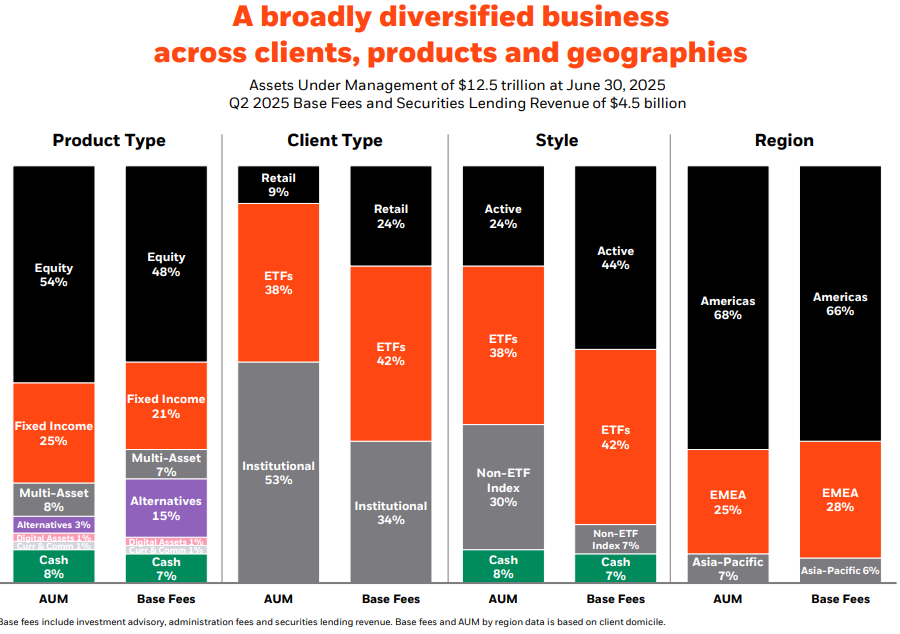 Η αμερικανική εταιρία διαχείρισης περιουσίας Blackrock ανακοίνωσε (15.07) ότι τα συνολικά κεφάλαια υπό διαχείριση (AUM) ξεπέρασαν τα $12 τρισ, αγγίζοντας στο Q2:2025 τα $12,5 τρισ, που αποτελεί ιστορικό ρεκόρ για την εταιρία και την βάζει στην κορυφή της λίστας των σχετικών εταιριών παγκοσμίως. Tα κεφάλαια που επενδύονται στα iShares ETFs της Blackrock άγγιξαν τα $4,7 τρισ.