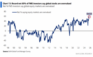 Οι θεσμικοί επενδυτές που συμμετείχαν στην μηνιαία έκθεση (FMS – Global Fund Manager Survey) της Bank of America τον ΟΚΤ, θεωρούν σε ποσοστό 60% (=ιστορικό ρεκόρ) τις παγκόσμιες μετοχές υπερτιμημένες. Μάλιστα ποσοστό 54% πιστεύουν ότι οι μετοχές AI βρίσκονται σε περιοχή φούσκας.