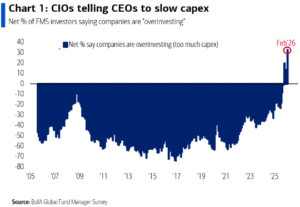 Οι θεσμικοί επενδυτές ανησυχούν ολοένα και περισσότερο ότι οι εταιρείες υπερεπενδύουν, ακριβώς τη στιγμή που το κλίμα της αγοράς παραμένει «υπερβολικά αισιόδοξο» και τα περαιτέρω κέρδη από τα περιουσιακά στοιχεία φαίνονται πιο δύσκολο να επιτευχθούν. Αυτό έδειξε η μηνιαία έρευνα διαχειριστών κεφαλαίων της Bank of America την Τρίτη.