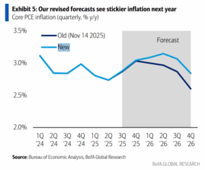 Η BofA στις αναθεωρημένες προβλέψεις της, βλέπει τον πληθωρισμό (Core PCE) στις ΗΠΑ να παραμένει σε υψηλά επίπεδα και να μην υποχωρεί γρήγορα κατά τη διάρκεια του 2026. Η αποκλιμάκωση επιτοκίων αποτελεί για το 2026 σημαντικό στοιχείο για τη συνέχιση της ανοδικής κίνησης των αμερικανικών μετοχών, ειδικά των τεχνολογικών. Επομένως, η BofA αναδεικνύει ένα ρίσκο του 2026 για τις αγορές.