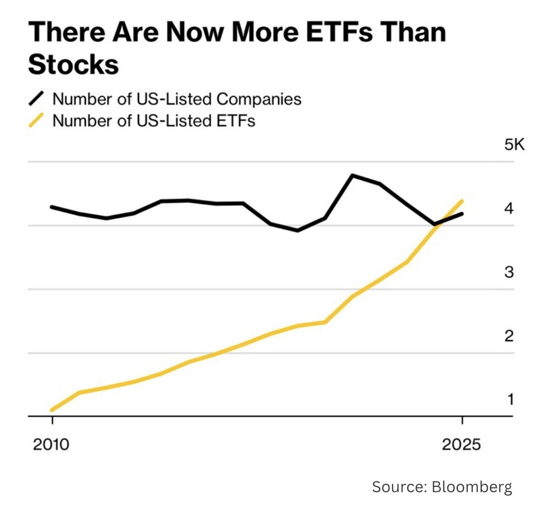 Ο αριθμός των αμερικανικών ETFs υπολογίστηκε από την Morningstar στα 4.300 περίπου όταν αντίστοιχα οι εισηγμένες μετοχές υπολογίζονται γύρω στις 4.200. Για πρώτη φορά ιστορικά, τα ETFs υπερτερούν σε αριθμό τις μετοχές.