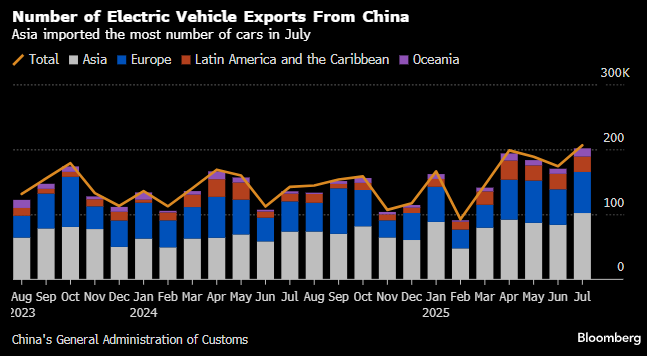 Οι πωλήσεις κινεζικών ηλεκτρικών αυτοκινήτων (EV) παγκοσμίως, αυξήθηκαν κατά 45% y/y τον Ιούλιο, στα 206.409 οχήματα.