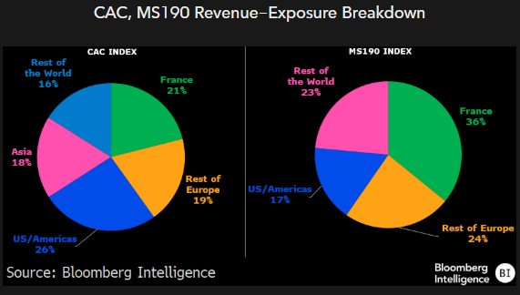 Η έκθεση (πωλήσεις) των γαλλικών εταιριών, που οι μετοχές τους συμμετέχουν στον δείκτη αναφοράς μετοχών CAC, στην οικονομία της Γαλλίας είναι μόνο 21%. Το αντίστοιχο ποσοστό στο δείκτη μικρής-μεσαίας κεφαλαιοποίησης MS190 είναι 36%.