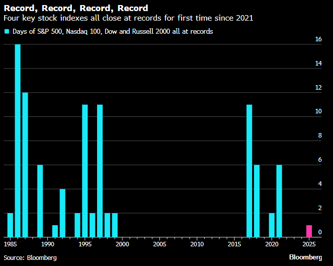 Οι 4 βασικοί δείκτες αναφοράς αμερικανικών μετοχών, S&P500, Nasdaq 100, Dow Jones Industrial Average και Russell 2000 (μικρή κεφαλαιοποίηση) έκλεισαν μαζί σε νέα ιστορικά υψηλά επίπεδα, κάτι που δε συμβαίνει συχνά. Συγκεκριμένα, την τελευταία φορά που είχε γίνει ήταν το 2021, ενώ συνολικά εχει συμβεί 25 φορές μόνο τα τελευταία 100 χρόνια.