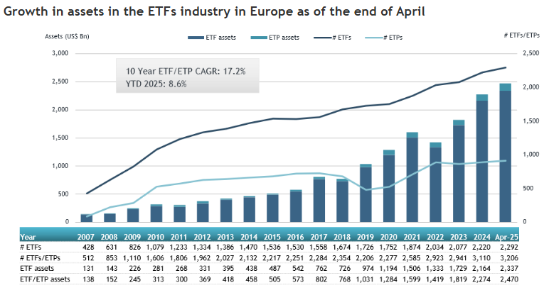 Στην ευρωπαϊκή αγορά των ETFs τον μήνα Απρίλιο, σημειώθηκαν καθαρές εισροές $19,56 δισ, οδηγώντας τις καθαρές εισροές του 2025 (YTD) στα $118,60 δισ που αποτελεί ιστορικό ρεκόρ (προηγούμενα ρεκόρ 4μηνου 2021: +$78,84 δισ, 2022: +$66,83 δισ) (Πηγή: ETFGI)…