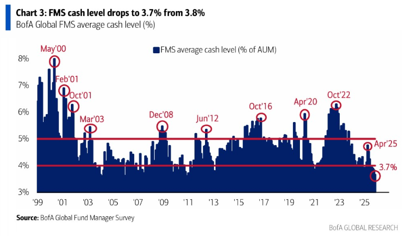 Οι θεσμικοί επενδυτές διακρατούν μετρητά στα χαρτοφυλάκιά τους σε ποσοστό μόνο 3,7%, σύμφωνα με την μηνιαία έκθεση FMS – Global Fund Manager Survey της Bank of America του ΝΟΕ.