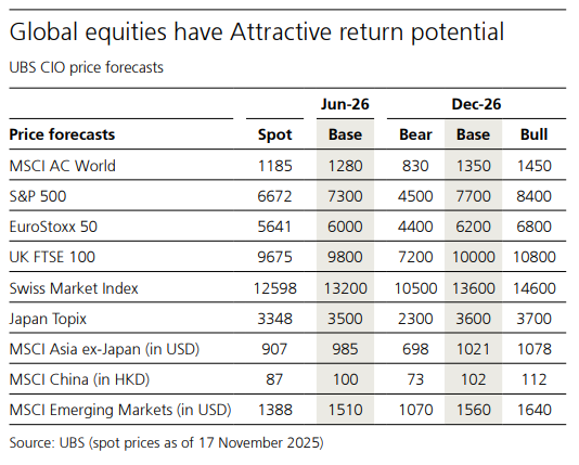 Η UBS σε πρόσφατη έκθεσή της (UBS Equity Compass-Powering ahead, 20.11.2025) δίνει τις τιμές στόχους 2026 για διάφοους δείκτες αναφοράς.