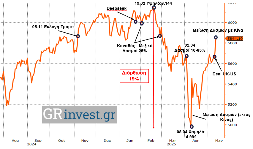 Η σημερινή άνοδος του S&P 500 (που βασίστηκε σε κλείσιμο συμφωνίας ΗΠΑ-Ην.Βασιλείου για τους δασμούς) έφερε το δείκτη κοντά στον Κινητό Μέσο Όρο 200 Ημερών που είναι οι 5.747 μονάδες…