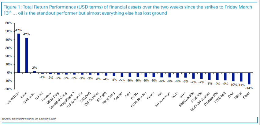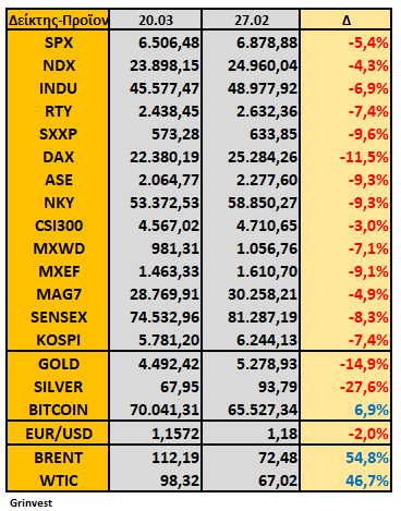 Ο πόλεμος στη Μέση Ανατολή είχε σαν αποτέλεσμα την αύξηση τιμής του πετρελαίου και πτώση όλων των άλλων επενδυτικών προϊόντων-δεικτών με εξαίρεση το Bitcoin. Eπίσης παρατίθεται πίνακας αποδόσεων από τα πρόσφατα υψηλά τους: