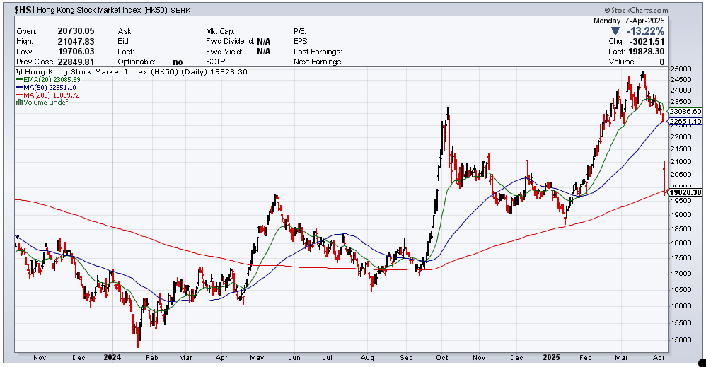 Ο δείκτης αναφοράς μετοχών του Χονγκ Κονγκ Hang Seng (HSI) σημείωσε ημερήσια πτώση -13,22% (κραχ) κλείνοντας στις 19.828,30 μονάδες, αποτέλεσμα της κλιμάκωσης του εμπορικού πολέμου καθώς η Κίνα ανταπέδωσε (04.04) στην αύξηση δασμών Trump (03.04 στο συνολικό +54%) με αύξηση δασμών προς ΗΠΑ +34% (ισχύ από 10.04).