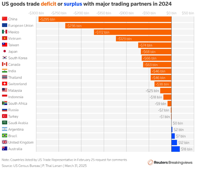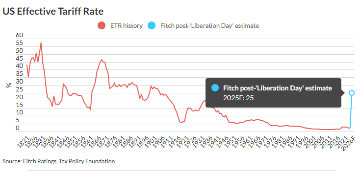 Μετά την ανακοίνωση των δασμών Τrump (02.04.25), η Fitch Ratings υπολόγισε ότι ο Συνολικός Τελικός (Αποτελεσματικός) Φορολογικός Συντελεστής (ETR) στις ΗΠΑ εκτοξεύτηκε από το 2,3% στα τέλη του 2024 σε 25% που αποτελεί υψηλό από το 1909.