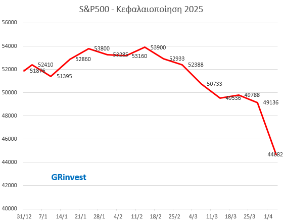 04.04: 5074,08, -5,97% 03.04: 5396,52, -4,84% , με κύριο λόγο τις συνέπειες της πολιτικής Trump 2.0.