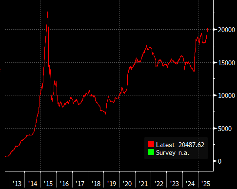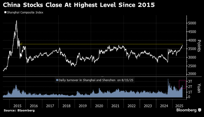 Ο κινεζικός δείκτης αναφοράς μετοχών CSI 300 έκλεισε στις 3.728 μονάδες τη Δευτέρα, σημειώνοντας άνοδο 0,9% και άνοδο 20% από τα χαμηλά του ΑΠΡ.’25. Το επίπεδο αυτό αποτελεί υψηλό 10ετίας. Οι κινέζοι επενδυτές δείχνουν πιο αισιόδοξοι για την πορεία των μετοχών μετά από την πρόσφατη νέα παράταση Trump για τους δασμούς. Επίσης, οι επενδυτές αισιοδοξούν ότι μετά την μεγάλη υποχώρηση της οικονομικής δραστηριότητας τον Ιούλιο, η κινεζική κυβέρνηση θα προβεί σε μεγαλύτερη στήριξη με σχετικά προγράμματα. Nomura Holdings και Commerzbank υποστηρίζουν ότι μέτρα στήριξης της οικονομίας θα μπορούσαν να ανακοινωθούν το H2:2025.