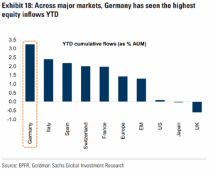 Oι καθαρές εισροές στις γερμανικές μετοχές το 2025 είναι οι μεγαλύτερες ανάμεσα στις αναπτυγμένες αγορές το 2025. Συγκεκριμένα, οι εισροές στα μετοχικά funds υπολογίζονται άνω του 3% των υπό διαχείριση κεφαλαίων τους (AUM) (Πηγή: EPFR Global, GS).