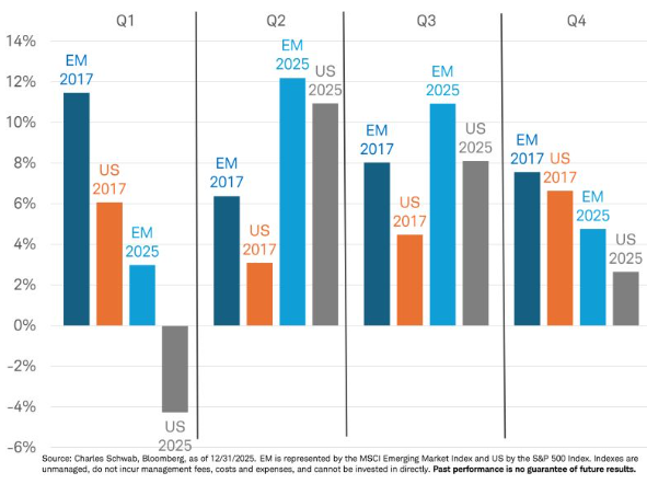 Οι αναδυόμενες αγορές σημείωσαν καλύτερες επιδόσεις κάθε τρίμηνο το 2025, όπως και κατά τη διάρκεια του εμπορικού πολέμου κατά το πρώτο έτος της πρώτης θητείας του Τραμπ. Η αύξηση των κερδών για ονόματα που σχετίζονται με την τεχνητή νοημοσύνη στις αναδυόμενες αγορές, η καλύτερη από την αναμενόμενη παγκόσμια ανάπτυξη, οι ελκυστικές αποτιμήσεις και το αδύναμο δολάριο συνέβαλαν στην απόδοση αυτή, η οποία θα μπορούσε να συνεχιστεί ξανά το 2026: