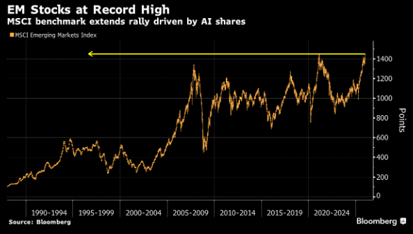 Ο δείκτης των αναδυόμενων αγορών MSCI Emerging Markets Index (MXEF) έκλεισε με άνοδο +1,55%, στις 1.451,68 μονάδες, σημειώνοντας νέο ιστορικό ρεκόρ στην ιστορία των 38 ετών της υπαρξής του. Επίσης, το ξεκίνημα αυτό του δείκτη το 2026, είναι το καλύτερο από το 2018.