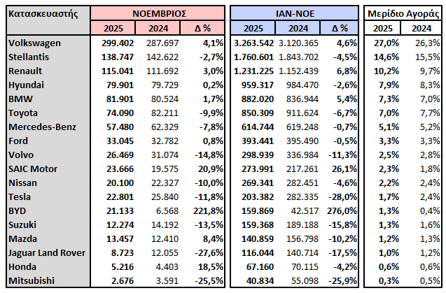 Από την αρχή της χρονιάς (ytd) στην Ευρωπαϊκή Ένωση σημειώνεται αύξηση των πωλήσεων +1,4% (οχήματα: 9.860.092) σε σχέση με το 2024.