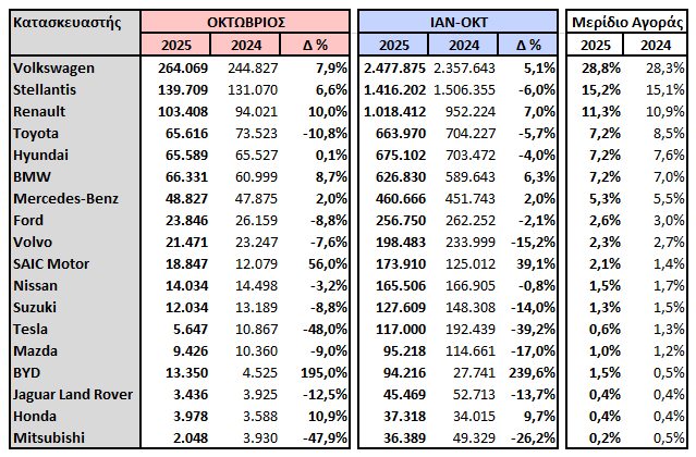 Στην Ελλάδα οι πωλήσεις τον ΟΚΤ ανήλθαν σε 10.763 οχήματα, σημειώνοντας άνοδο +11,3% σε σχέση με τον ΟΚΤ’24. Αναλυτικότερα: