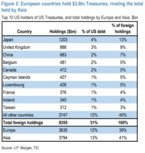 Οι ευρωπαϊκές χώρες και οι επενδυτές τους κατέχουν συνολικά περίπου $8 τρισ σε αμερικανικά περιουσιακά στοιχεία (μετοχές και ομόλογα), γεγονός που καθιστά την Ευρώπη τον μεγαλύτερο ξένο δανειστή των ΗΠΑ.