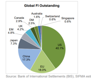 2024: Η παγκόσμια αγορά ομολόγων υπολογίζεται στα $145,1 τρισ (Πηγή: SIFMA). Η μεγαλύτερη αγορά ομολόγων είναι η αμερικανική, με $58,2 τρισ, που αποτελεί το 40,1% της παγκόσμιας αγοράς. Η αμέσως μεγαλύτερη αγορά είναι αυτή της Ευρωζώνης αλλά με ποσοστό μόλις 18,0% της παγκόσμιας αγοράς ομολόγων.