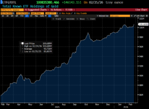 Το ενδιαφέρον των επενδυτών αποτυπώνεται στις καθαρές εισροές στα ETFs χρυσού. Η ποσότητα του χρυσού που διατηρούν τα ETFs αγγίζει πλέον το ρεκόρ (από ΑΥΓ.’22) των 100,83 εκ ουγγιών.