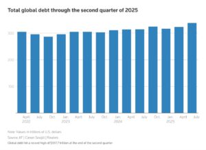 Σύμφωνα με αναφορά (25.09) του Institute of International Finance (IIF) το παγκόσμιο χρέος άγγιξε τα $337,7 τρισ στο τέλος του Q2:2025, που αποτελεί ιστορικό ρεκόρ.