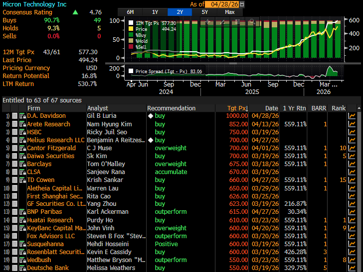 «Δεν υποστηρίζουμε ότι δεν υπάρχει κύκλος, απλώς ότι η διάρκεια και η έκταση του κύκλου ενδέχεται να μην έχουν αποτιμηθεί σωστά». Από τους 44 αναλυτές που καλύπτουν την Micron στη Wall Street, οι 41 δίνουν στη μετοχή αξιολόγηση «αγορά» ή «ισχυρή αγορά», σύμφωνα με τα στοιχεία της LSEG.