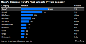 Οι επενδυτές αυτοί συμφώνησαν να αγοράσουν τις μετοχές σε μια συγκεκριμένη τιμή, η οποία αντιστοιχεί σε μία συνολική αποτίμηση για την OpenAI στα $500 δισ. Η αποτίμηση αυτή καθιστά την OpenAI στην πολυτιμότερη ιδιωτική εταιρία παγκοσμίως.