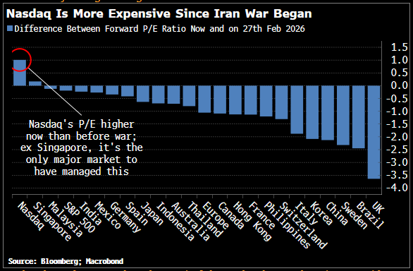 Σημειώνεται όμως ότι η αποτίμηση του Nasdaq 100 είναι υψηλότερη από ό,τι ήταν πριν από τον πόλεμο, και είναι η μόνη μεγάλη αγορά που έχει επιτύχει αυτό, εκτός από τη Σιγκαπούρη: