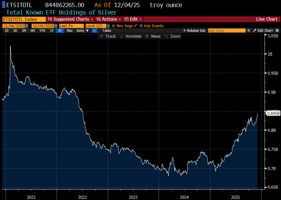 Νέο ιστορικό ρεκόρ για το ασήμι στα $59,33/ουγγιά την Παρασκευή 05.12. Οι συνολικές εισροές στα ETFs ασημιού στις 4 μέρες της εβδομάδας που πέρασε (ΔΕΥΤ-ΠΕΜΠΤ) ήταν οι μεγαλύτερες σε εβδομαδιαίο επίπεδο από τον ΙΟΥΛ.΄25.