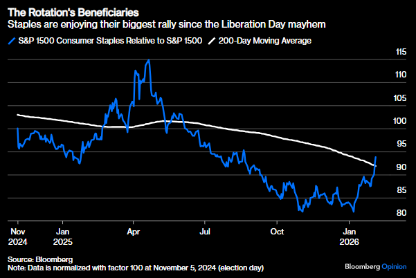 Η BofA αναφέρει ότι οι καθαρές εισροές (Μ.Ο. 4 εβδομάδων σε % της συνολικής κεφαλαιοποίησης ) στον κλάδο Consumer Staples (βασικά καταναλωτικά αγαθά) έχουν φτάσει στο υψηλότερο επίπεδο όλων των εποχών (στοιχεία από το 2008).