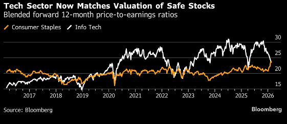 Δύο κλάδοι που συχνά κινούνται σε αντίθετες κατευθύνσεις, ο τεχνολογικός και των βασικών καταναλωτικών αγαθών (consumer staples) έχουν πλέον την ίδια αποτίμηση.