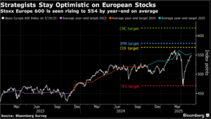O ευρωπαϊκός δείκτης αναφοράς μετοχών Stoxx 600 (SXXP) έχει τιμή στόχο 554 μονάδες (Πηγή: Bloomberg, 20 εκτιμήσεις) που δεν απέχει από τις τρέχουσες τιμές (552 μον).