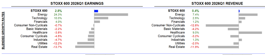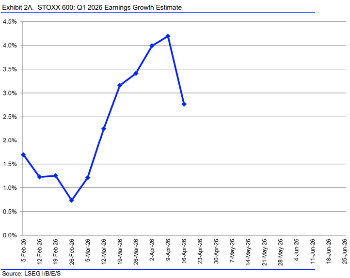 Οι προβλέψεις για τα κέρδη των ευρωπαϊκών εταιριών (δείκτης SXXP) για το Q1:2026 είναι στο +2.8% (Πηγή: LSEG I/B/E/S, 16.04.2026).