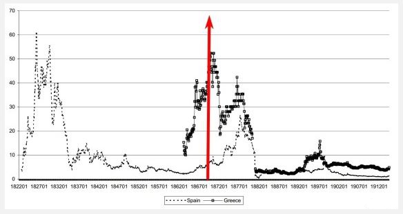 10/04/1867: η Ελλάδα μπήκε στην Λατινική Νομισματική Ένωση. Η Λατινική Νομισματική Ένωση (ΛΝΕ) ιδρύθηκε στις 23/12/1865 σε μια προσπάθεια για ενοποίηση πολλών ευρωπαϊκών νομισμάτων σε ένα ενιαίο νόμισμα που θα μπορούσε να χρησιμοποιηθεί σε όλα τα κράτη μέλη σε μια εποχή που τα περισσότερα εθνικά νομίσματα εξακολουθούσαν να είναι άμεσα συνδεδεμένα με τον χρυσό και τον άργυρο. Σκοπός η διευκόλυνση των συναλλαγών και του εμπορίου.