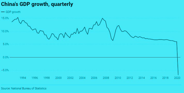 17/04/2020: Ιστορική πτώση 6,8% του ΑΕΠ στην Κίνα. Συγκεκριμένα, σύμφωνα με επίσημα στοιχεία, το Ακαθάριστο Εγχώριο Προϊόν (ΑΕΠ) της Κίνας στο 1ο τρίμηνο του 2020 συρρικνώθηκε κατά -6,8% (σε ετήσια βάση) καθώς την περίοδο αυτή η οικονομία είχε ‘κλείσει’ λόγω κορωνοϊού COVID-19.