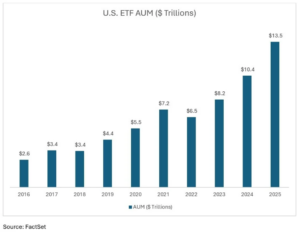 Τα κεφάλαια υπό διαχείριση (AUM) των αμερικανικών ETFs αυξήθηκαν κατά 30% το 2025 στα $13,5 τρισ. Από την αύξηση αυτή, περίπου η μισή 14,7% προέρχεται από εισροές κεφαλαίων, ενώ το υπόλοιπο 15,7% είναι αποτέλεσμα της αύξησης της αξίας των χαρτοφυλακίων τους (μετοχές και ομόλογα).